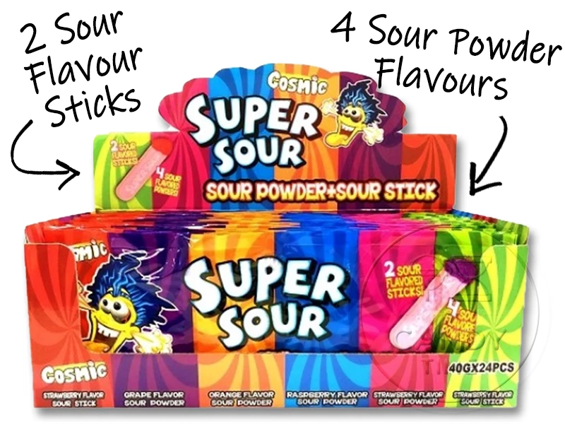 Treat your tastebuds with this combination of 4 flavours of super sour powder and 2 flavours of sour sticks. Mix and Match to create your perfect sour taste!