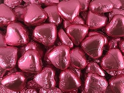 Milk Chocolate, foil wrapped hearts perfect for Valentines Day, wedding bonbonniere and coloured themed candy buffets. Each heart measures approximately 3cm in diameter and each 500g bag contains approximately 72 hearts.